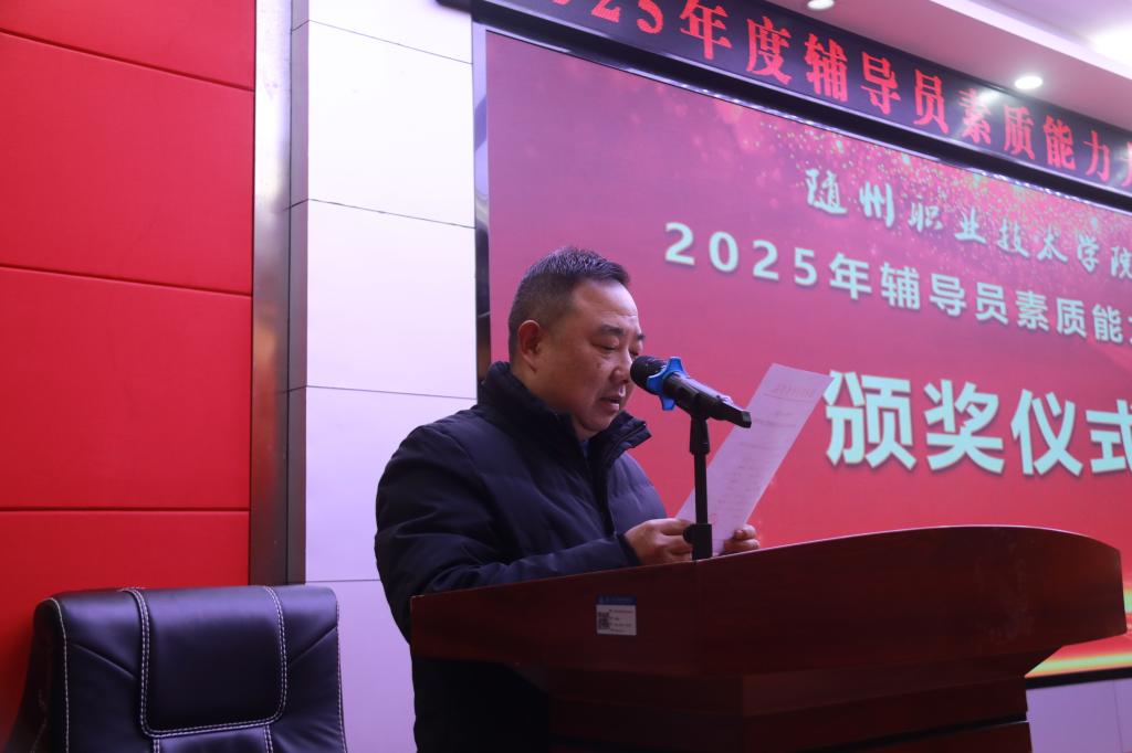 12月12日下午,2025年随州职业技术学院辅导员素质能力大赛颁奖仪式在学术报告厅隆重举行。党委委员、副校长邹厚亏,党委学生工作部部长钟守兵,校团委副书记王安琼,各二级学院党总支书记、副书记、学工办主任,全体专兼职辅导员及学生代表共160余人齐聚现场,共同见证荣耀时刻。